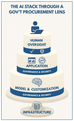 Tillipman explains her “wedding cake” model of the A.I. tech stack—chips, data and cloud infrastructure at the base; foundation models as the “brain”; applications near the top; and human oversight above it, with security and governance layered throughout.