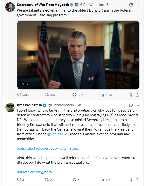 It’s now entirely plausible that the 8(a) program, though just 4% of Federal contract spending, could become a pivotal issue in a pivotal political race. That’s already part of the discussion. Bret Weinstein introduced Joe Rogan listeners to the 8(a) program in February last year. He observed on X that Hegseth’s video would “likely help Democrats win back the Senate.”