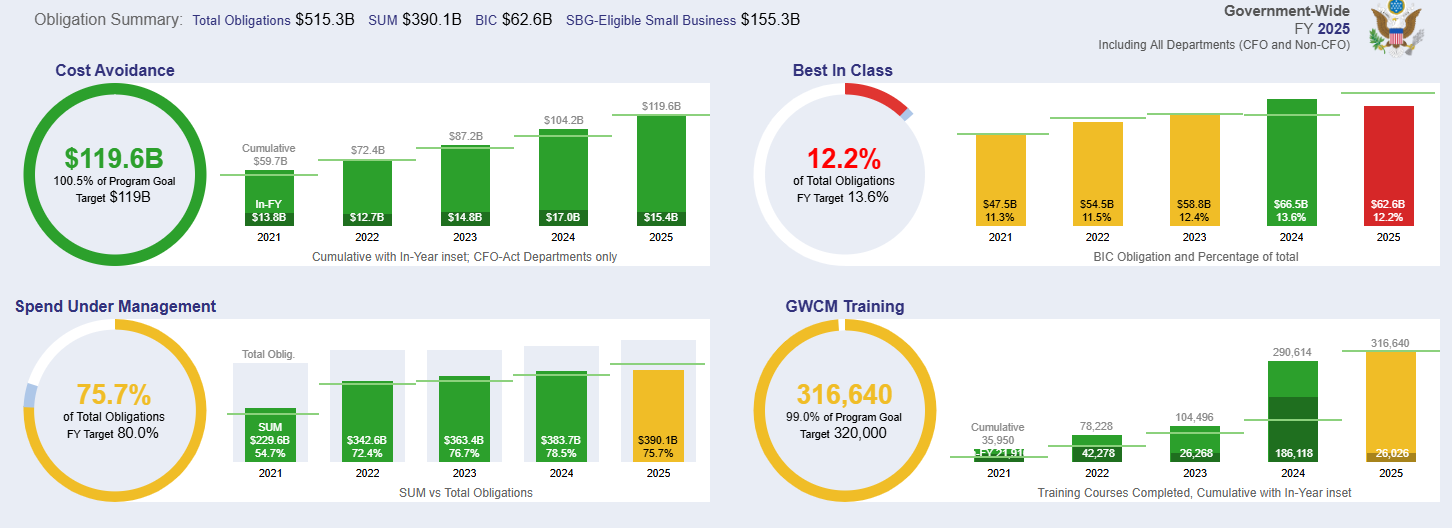 Agencies didn’t get that message. The use of best-in-class contracts fell to its lowest level since 2022, and the government fell well short of its 13.6% best-in-class goal. With an even higher level of Category Management on the horizon—the forthcoming “required use” designation—it’s not certain that best-in-class will survive the next few years.