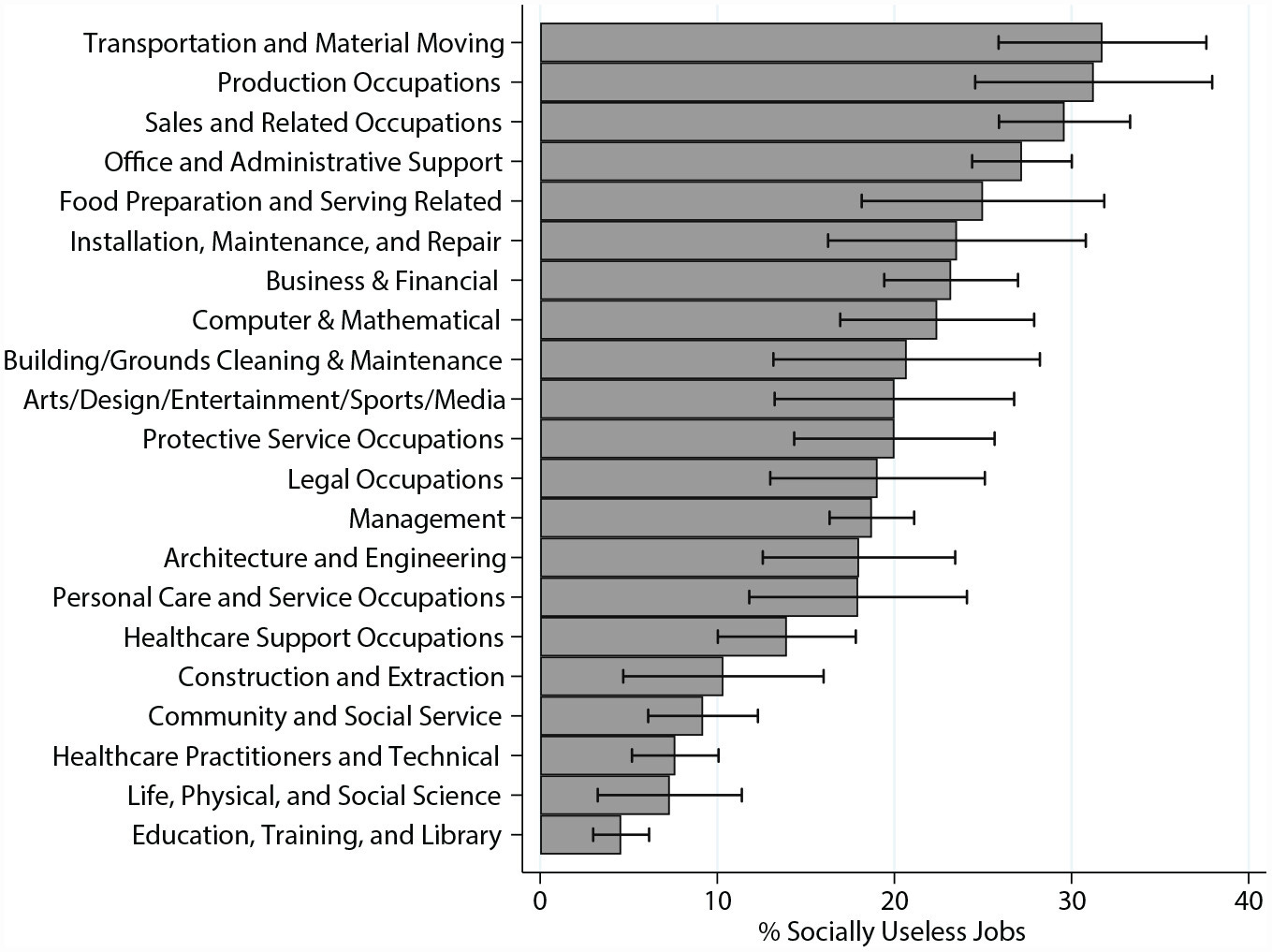 David Graeber wrote the Bullshit Jobs theory after the Great Recession about the growing phenomenon of people feeling their jobs were socially useless. Today, over 30% of workers in some sectors believe their jobs are socially useless. But the percentage is far less in teaching, science, and healthcare, according to a 2023 paper: